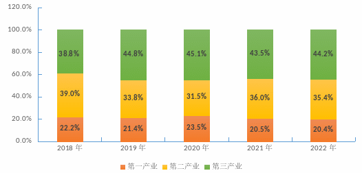 图2 2018年—2022年三次产业增加值占地区生产总值比重